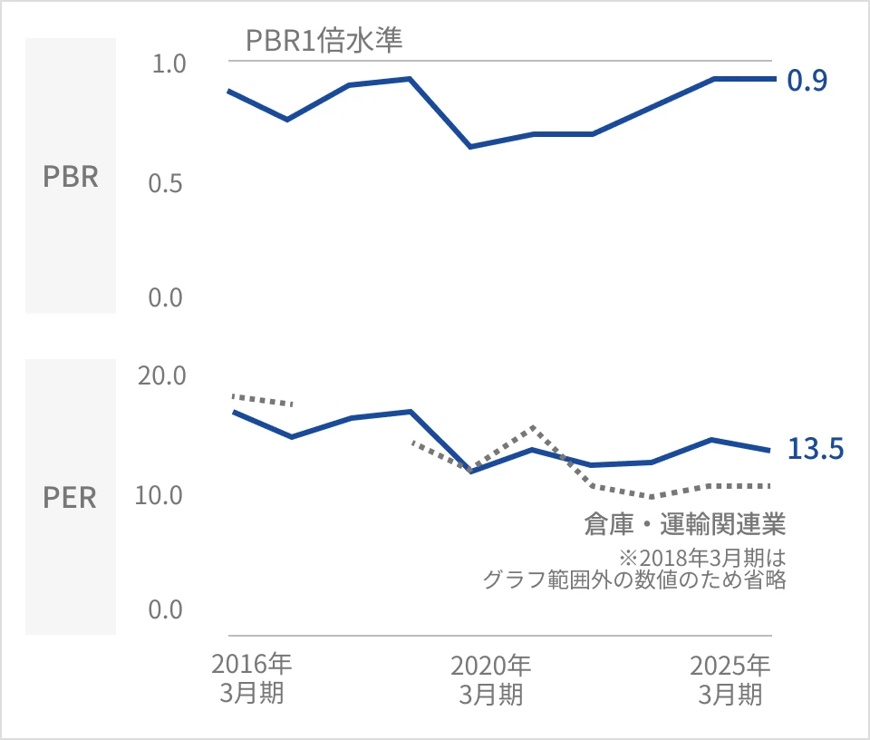 - 現在のPERは同業平均と同水準だが、PBRは1倍を下回っている。