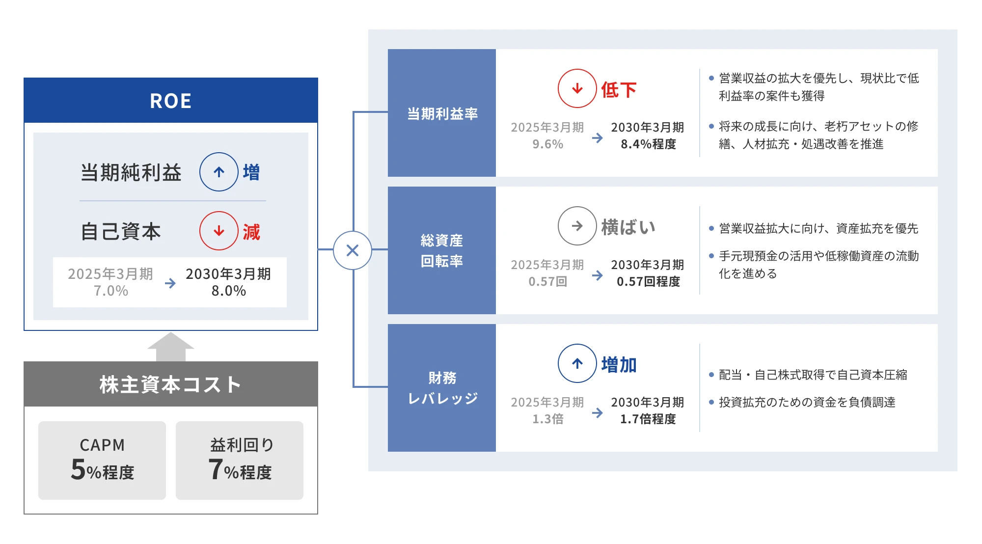 持続的な企業価値の向上を目指し、投資計画の着実な実行を通じて事業の成長を確保すると同時に、財務レバレッジと総資産回転率の改善により資本効率を高めます。さらに、資本コストを投資判断のハードルレートとして厳格に適用し、これを上回るリターンを追求することで企業価値のさらなる向上を図ります。
