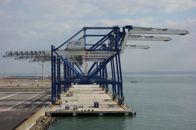 大型船の接舷が可能な水深15.5mの岸壁に、本船荷役用のガントリークレーン5基を備え、同時に最大3隻のコンテナ船荷役が可能です。さらに、2010年4月より、ターミナル東側に水深16mの岸壁と、世界最大級のガントリークレーン3基が新たに整備され、コンテナ船の超大型化にいち早く対応しています。