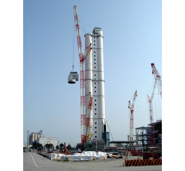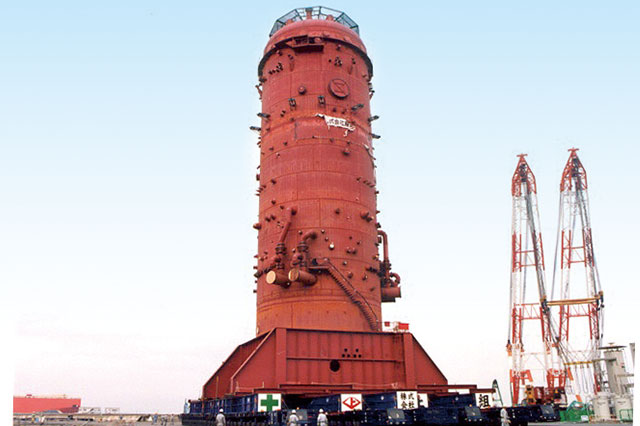 火力発電プラントモジュール輸送、ボイラーモジュール荷揚げ輸送据付までの一貫作業を行っています。(ボイラーモジュール重量:3,820t、直径:16m、高さ:52m)