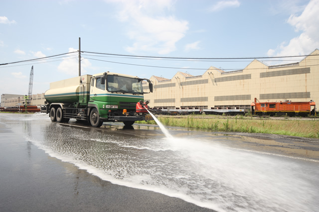 高まる環境対応ニーズに応えるために散水車による粉塵対策や、高所放水車による構内清掃作業にも対応しています。
