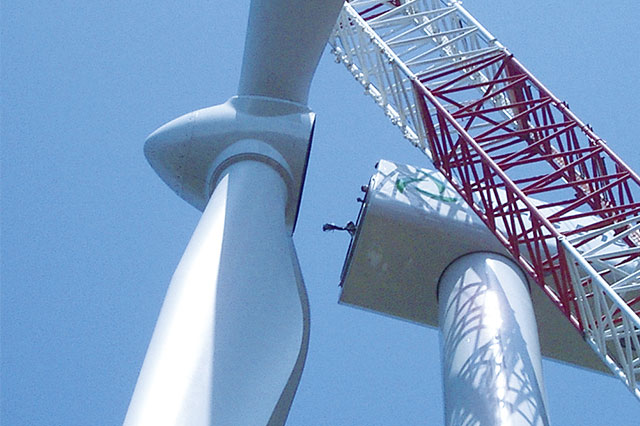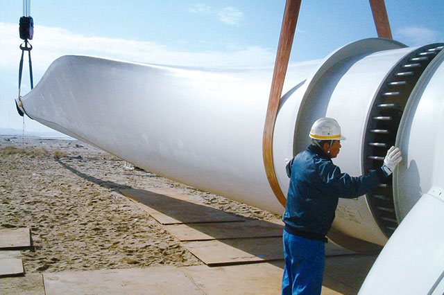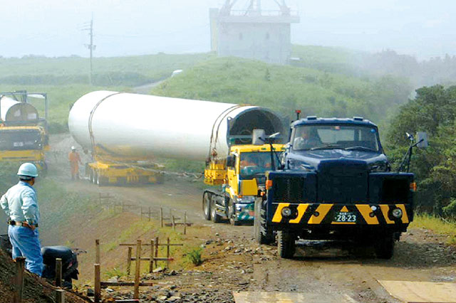 風車の部材の荷揚げ、運搬車両への積込み、据付場までの輸送ならびに風車の据付の一貫輸送作業を行っています。(発電容量:2MW、羽直径:約80m、高さ:約80m)