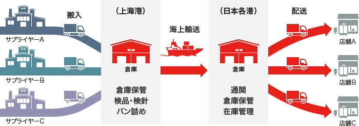 中国国内の各サプライヤーから上組倉庫に搬入、検品・検針後、貨物を同一のコンテナにまとめて日本に輸出。日本側では通関から各店舗配送まで、納期に合わせた自社での一貫輸送・管理サービスをご提供しています。輸送・情報を一括管理することにより、コストの抑制はもちろん、納期管理にも効率的です。