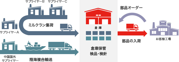 各部品サプライヤー様からのミルクラン集荷貨物+海外からの一貫輸送による部材調達品の集約・流通加工(検品・詰替・簡易加工)を行い、生産現場へのJIT(=Just in Time)輸送を実施しています。集荷業務にはGPSを活用し、正確・効率的な車両運行管理を実施しています。