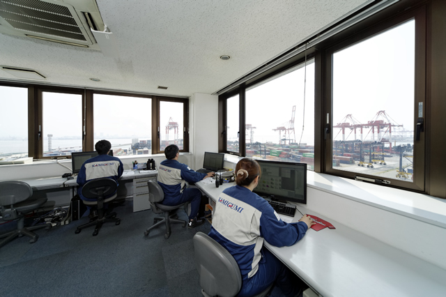 コンテナターミナルの中枢部であるオペレーションセンターにて、本船の荷揚げ作業の進捗状況から、船積み・船卸しするコンテナの仮置き位置、輸入コンテナの引き取りのスケジュールまでを一括コントロール。熟練オペレータの的確な指示により、ガントリークレーン、トランスファークレーンなどの大型荷役機器を効率的に動かします。