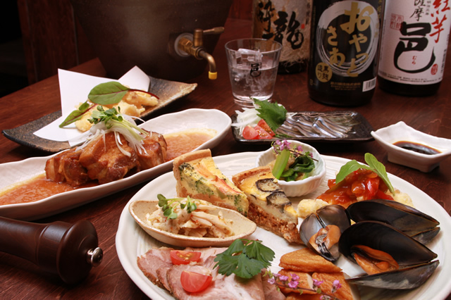 岩川醸造の本格芋焼酎をはじめ、蔵元ならではのこだわりの焼酎が楽しめる「蔵元酒場おやっとさぁ」。“焼酎に合う和洋折衷”をテーマに本格シェフが手掛ける鹿児島料理からイタリアンを気軽に堪能できるお店です。