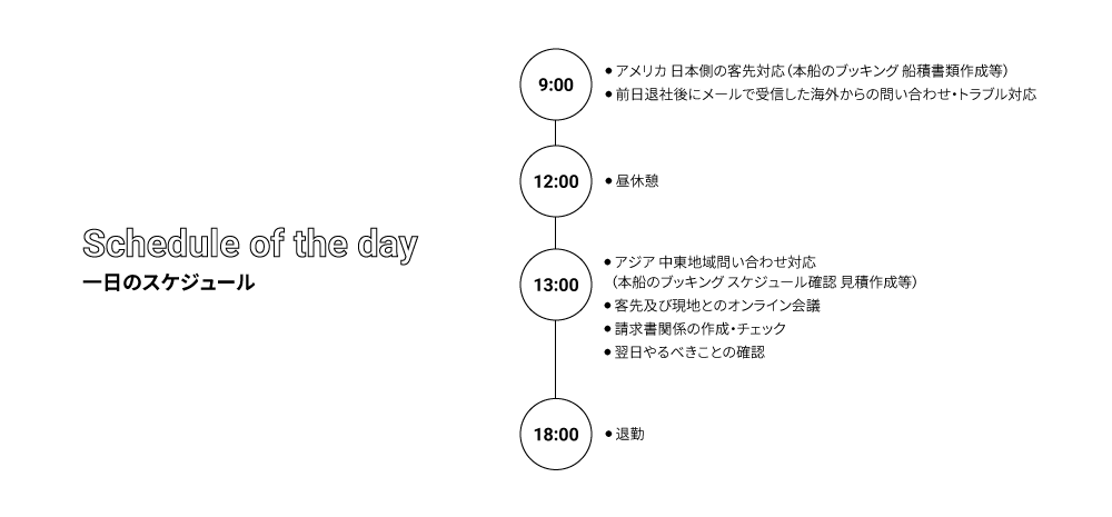 世界各国にいる関係者とのやりとりを通して、日本と世界をつなぐ物流基盤を支える一員となっていることを日々実感できることが最大のやりがいです。先方からの要求に対応し、感謝されることも日々のモチベーションとなっています。また、前例がないような地域、国への輸送に対して、自分で手段を探して新たなサービスを提供することができることも魅力のひとつだと思います。